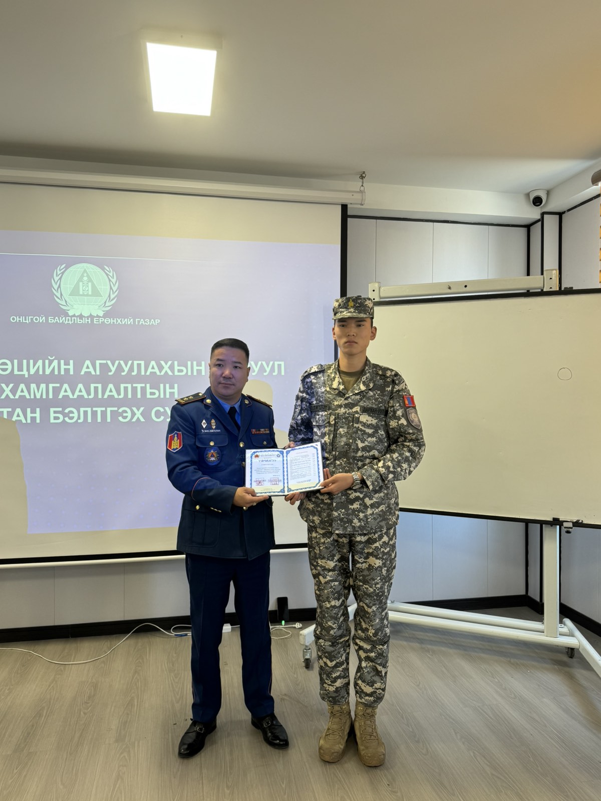 ОБЕГ-ын харьяа 119 дүгээр ангийг түшиглэн зохион байгуулж байгаа тус сургалт энэ сарын 24-нийг хүртэл үргэлжилнэ. Сургалтаар сэтгэл зүйн тухай ойлголт, сэтгэл зүйн бэлтгэлжилт хангах, гэмт хэрэг, зөрчлөөс урьдчилан сэргийлэх тухай хуулийн ойлголт, эд хөрөнгө, обьектын хамгаалалтын онол арга зүйг судлах, аюулгүй байдлын албаны үйл ажиллагааны үндсэн зарчим, Онцгой байдлын байгууллагын алба хаагчийн нэг бүрийн тусгай хэрэгсэл хэрэглэх үндэслэл, зааврыг дагаж мөрдөх, аюулгүй ажиллагааны зааврыг дагаж мөрдөх сэдвийн хүрээнд мэдээлэл өгч, алба хаагчдын мэдлэг, мэдээллийг дээшлүүлж байна.