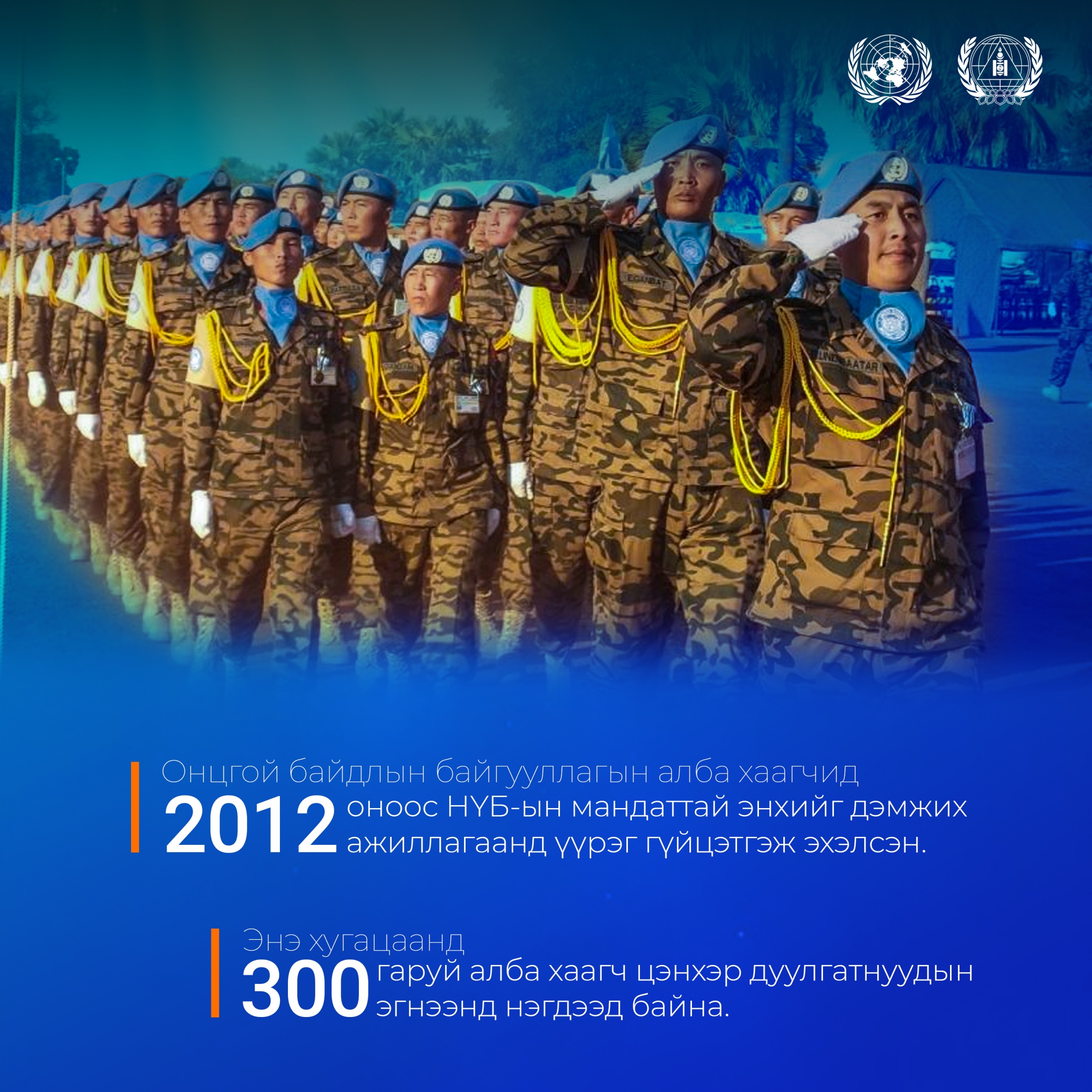 Онцгой байдлын байгууллагын алба хаагчид 2012 оноос хойш даян дэлхийн энх тайвны төлөө дэлхийн орнуудын дайчин эрстэй мөр зэрэгцэн энхийг сахиулах үүргийг гүйцэтгэж, энэ хугацаанд 300 орчим алба хаагч цэнхэр дуулгатнуудын эгнээнд нэгдээд байна.